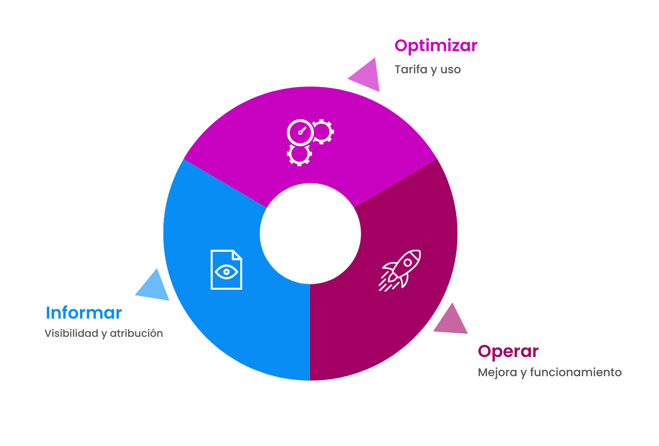 - Operar: Después de implementar soluciones alineadas con las finanzas, se pasa a evaluar continuamente el rendimiento frente a los objetivos del negocio buscando una mejora continua.